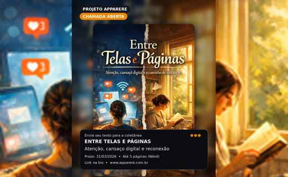“Entre Telas e Páginas é uma coletânea monotemática e multiestilo que reúne autores independentes para escrever sobre atenção, cansaço digital e reconexão: com o silêncio, com o corpo, com a leitura, com a escrita e com o que realmente importa.
